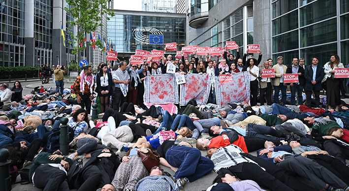 Brüksel’de AP önünde toplanan aktivistler, Gazze’de hayatını kaybedenleri simgeleyecek şekilde yere hareketsiz uzandı. Aktivistlere destek veren milletvekilleri de ellerinde “Soykırımı durdurun” yazılı pankartlar ve kanı simgeleyen kırmızı boyalı kefiyeler tutarak, “Avrupa harekete geçmeli” sloganları attı. Fransız milletvekili Manon Aubry, AA muhabirine, “Vermek istediğimiz mesaj, artık konuşmak için zaman kalmadığı, eyleme geçme zamanı olduğu ve yorulduğumuz, bıktığımızdır. Avrupa Birliği’nin (AB) Gazze konusunda sadece konuşup eyleme geçmemesine artık dayanamıyoruz” dedi.
