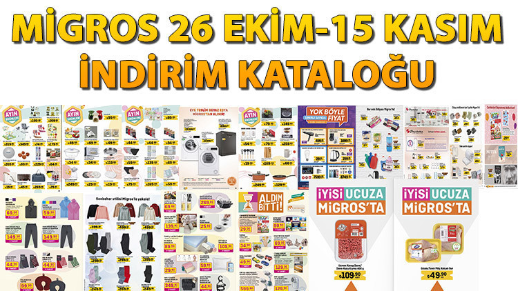 Migros’ta Kasım ayının ikinci haftasına kadar sürecek indirimler belli oldu. Yeni Migroskop dijital kataloğu yayınlandı. 120 sayfadan oluşan katalogda yüzlerce üründe indirim fırsatı Migros müşterilerine özel fiyatlarıyla olacak. Ahşap kesme tahtası 169,90 TL, 1400 CC Saklama Kabı 54,90 TL, Çiğ Köfte Tepsisi 119 TL, Narenciye Sıkacağı 249,90 TL, Çok Amaçlı Çanta 269,90 TL, Dambıl çeşitleri 99,90 TL’den müşterileri bekleyecek. Ayrıca 3 Tüplü Şömine Isıtıcı 699,90 TL, Elektrikli Fanlı Isıtıcı 299,00 TL, Lastikli Çarşaf 89,90 TL, Kadın-Erkek Kapüşonlu Mont 499,90 TL olacak. Elektronik mutfak ürünlerinde ise indirim fırsatı devam ediyor. Filtre Kahve Makinesi 1899 TL, 1.7 Litre Çelik Kettle 299,90 TL’den reyonlarda olacak. 139 ekran 4K Smart Televizyon 13.999 TL, Bluetooth Kulaklık 599 TL, Powerbank 299,90 TL’den satılacak. Migros’ta ayrıca temizlik ürünleri, et ve tavuk ürünleri yoğun ilgi görüyor. İşte, Migros 26 Ekim-15 kasım indirimli fiyatlar ve katalog…
