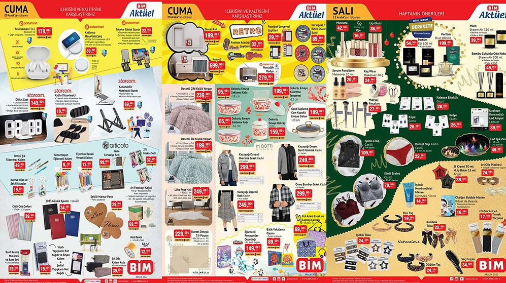 Müşterilerin merakla beklediği BİM 9-13 Aralık Aktüel Ürünler Kataloğu yayınlandı. BİM marketlerinde beklenen indirim günü geldi. Cuma gününden itibaren birçok kalem üründe indirim müşterileri bekliyor olacak. Temel gıda ürünleri ve temizlik ürünlerinin yanı sıra tekstil ürünlerinde de indirimler yapılacak. 13 Aralık’ta ise 5 litre ayçiçek yağı 169 TL’den, 1 kg çay 54.50 TL, 5 kg buğday unu 42,50 TL, 2 kg tam yağlı yoğurt 49.50 TL, 5 kg yarım yağlı süt 75 TL, 1 lt çocuk devam sütü 21,50 TL’den satışta olacak. Yılbaşına özel olarak makyaj malzemelerinde indirimler yapılacak. Bu hafta maskara 42.50 TL, oje 16.50 TL, lip gloss 36.50 TL, 100 ml erkek ve kadın parfümü 54,50 TL’den satılacak. İşte BİM 9-13 Aralık Aktüel Ürünler Kataloğu
