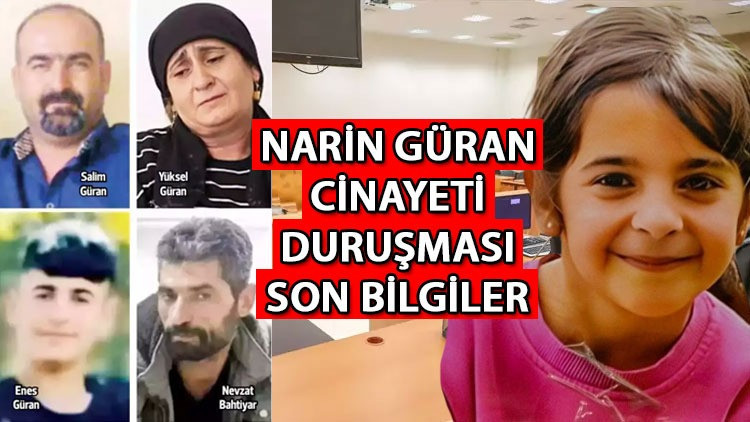 Diyarbakır'da kaybolduktan 19 gün sonra dere yatağında çuvalda cansız bedeni bulunan Narin Güran cinayetine ilişkin haklarında 'İştirak halinde çocuğa karşı kasten öldürme' suçundan ağırlaştırılmış müebbet hapis cezası istemiyle dava açılan tutuklu sanıklar annesi Yüksel, ağabeyi Enes ve amcası Salim Güran ile Nevzat Bahtiyar'ın yargılandığı davada ilk duruşma başladı. Tutuklu bulundukları cezaevlerinden getirilen Nevzat Bahtiyar, amca Salim Güran, ağabey Enes Güran ve anne Yüksel Güran, duruşma salonunda hazır bulundu.