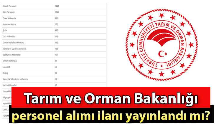 Tarım ve Orman Bakanlığı tarafından personel alımı yapılacak toplam kontenjan ve meslek dağılımı duyuruldu. Ancak personel alımı ilanı henüz Resmi Gazete’de yayınlanmadı. Personel alımına ilişkin ilk ve son başvuru tarihi, genel şartlar, özel şartlar (eğitim, yaş, sınav) personel alımı ilanının yayınlanmasının ardından belli olacak.