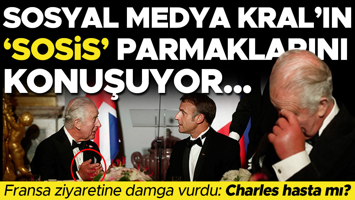 Fransa ziyareti için uzun bir yolculuk yapan Kral Charles, Macron'un düzenlediği akşam yemeğinde yine şişmiş parmakları ile dikkat çekti.