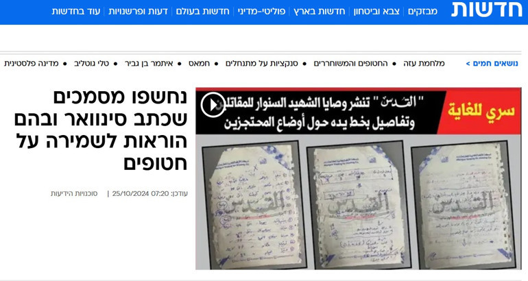İsrailli haber sitesi Walla'nın Filistin merkezli El Kudüs gazetesinden aktardığı haberde, Sinwar tarafından yazılan ve rehinelerin yaşları ile cinsiyetlerini içeren belgelerin ortaya çıktığı belirtildi.
