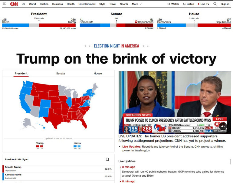 ABD'li yayın kuruluşu CNN International yeni başkanın zafer konuşmasını canlı yayınlarken, kanalın internet sitesinin manşetinde kesin ifadeler yerine "Trump zaferin eşiğinde" vurgusu dikkat çekti. İki partiden yorumcuların katıldığı canlı yayının KJ'sinde de Trump'ın mecazen "savaş alanı" olarak nitelendirilen salıncak eyaletleri aldıktan sonra başkanlığı garantilemeye hazır olduğu belirtildi.