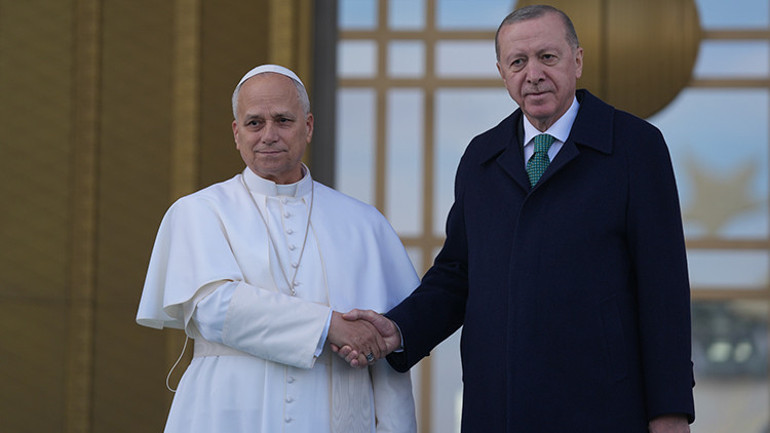 Papa 14. Leo ve heyetini Ankara'da ağırlamaktan duyduğu memnuniyeti dile getiren Cumhurbaşkanı Erdoğan, Papa 14. Leo'nun göreve başladıktan sonra ilk yurt dışı seyahatini Türkiye'ye gerçekleştirmesini her bakımdan çok anlamlı bulduğunu söyledi.