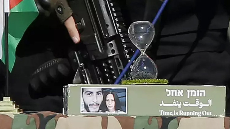 Kassam Tugayları İsrailli esir Yair Horn'a, üzerinde esirlerden Matan Tsengauker ve annesinin fotoğrafının bulunduğu ve 'zaman tükeniyor' yazılı kum saati hediye etti.