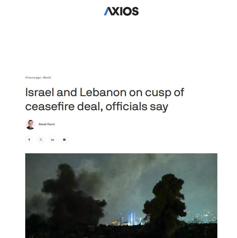 ABD medyasında yer alan haberlere göre, İsrail ve Hizbullah Lübnan'daki çatışmayı sona erdirmek için anlaşmasının eşiğinde. İki üst düzey İsrailli yetkili ve iki ABD'li yetkili Axios'a verdikleri bilgiye göre, taslak ateşkes anlaşması, İsrail ordusunun güney Lübnan'dan çekileceği, Lübnan ordusunun sınıra yakın bölgelerde konuşlanacağı ve Hizbullah'ın ağır silahlarını Litani Nehri'nin kuzeyine taşıyacağı 60 günlük bir geçiş dönemi içeriyor.