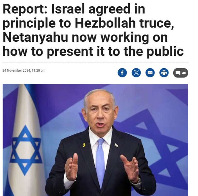 İsrail resmi televizyonu KAN ise ABD destekli ateşkes konusunda İsrail ve Lübnan arasında prensipte anlaşmaya varıldığını, Başbakan Netanyahu'nun şimdi bunu kamuoyuna nasıl sunacağı üzerinde çalıştığını duyurdu. İsrail medyasına göre, Netanyahu bunu bir uzlaşı olarak değil İsrail'in yararına bir anlaşma gibi sunacak.