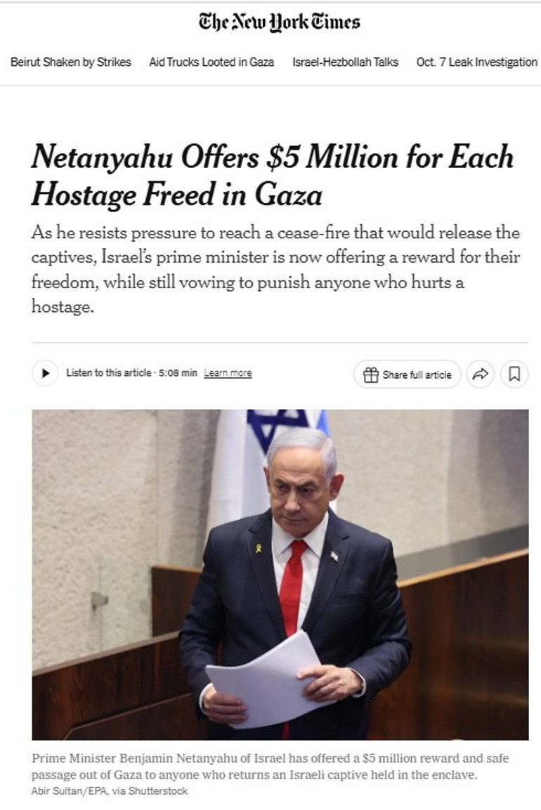 New York Times gazetesinde yer alan habere göre Netanyahu, İsrail'in rehinelere zarar veren herkesi yakalayıp cezalandıracağına dair verdiği sözü yineledi.