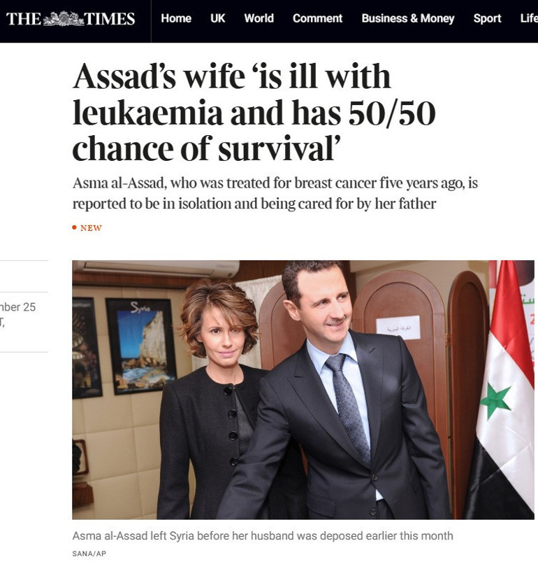 Suriye'nin Rusya'ya kaçan devrik lideri Beşşar Esad'ın eşi Esma Esad'ın, ağır lösemi hastası olduğu ve yaşama şansının yüzde 50 olduğu bildirildi.
