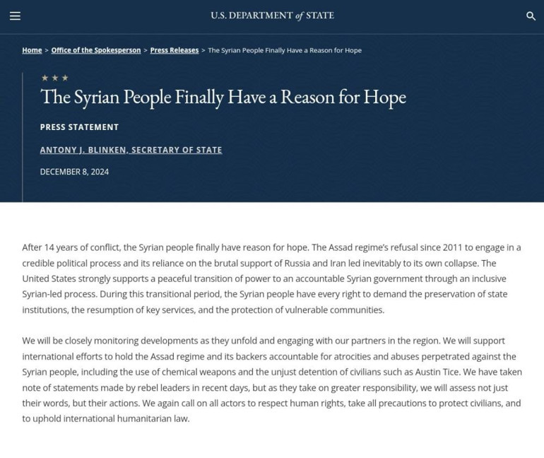 ABD Dışişleri Bakanı Antony Blinken, Suriye'de yaşanan gelişmelerle ilgili yazılı bir açıklama yayınladı. Açıklamasında, Suriye halkının 14 yıl süren çatışmaların ardından nihayet umutlanmak için bir nedeninin olduğunu kaydeden Blinken, “Esad rejiminin 2011'den bu yana güvenilir bir siyasi sürece dahil olmayı reddetmesi ve Rusya ile İran'ın acımasız desteğine bel bağlaması, kaçınılmaz olarak kendi çöküşüne yol açmıştır” yorumunda bulundu. “ABD, Suriye liderliğindeki kapsayıcı bir süreç yoluyla iktidarın hesap verebilir bir Suriye hükümetine barışçıl yollardan devrini güçlü bir şekilde desteklemektedir” diyen Blinken,“Suriye halkının, bu geçiş döneminde devlet kurumlarının muhafaza edilmesini, temel hizmetlerin yeniden başlatılmasını ve savunmasız toplulukların korunmasını talep etmeye hakkı vardır” ifadelerini kullandı.
