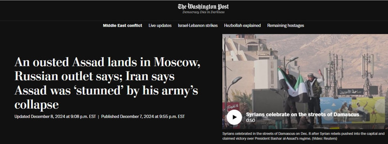 Rusya'da resmi haber ajansları ve devlet televizyonu, Beşar Esad'ın ailesiyle birlikte Moskova'da olduğunu duyurdu.TASS ve RIA Novosti, Esad'a "insani kaygılarla" siyasi sığınma hakkı verildiğini bildiriyor.Ajanslar haberlerini Kremlin kaynaklarına dayandırırken, Rusya'nın Viyana'daki uluslararası kurumlar temsilcisi Mihail Ulyanov da Telegram hesabında haberi teyit etti.