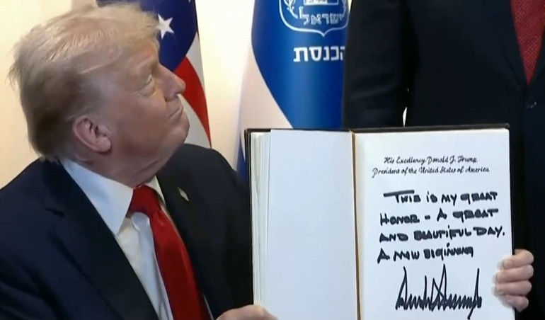 İsrail Meclis binasına gelen Trump, burada imzaladığı deftere "Bu benim için büyük onur. Bugün büyük ve güzel bir gün. Bu yeni bir başlangıç" ifadelerini yazdı.