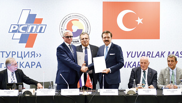TÜRKİYE Odalar ve Borsalar Birliği (TOBB) Başkanı Rifat Hisarcıklıoğlu, 21’inci yüzyılın global seviyede yeni dengelerin ortaya çıktığı, dünya ekonomik ekseninin batıdan doğuya kaydığı bir yüzyıl olduğunu ifade ederek, yeni dengenin tam merkezinde Rusya ve Türkiye’nin bulunduğunu söyledi. Hisarcıklıoğlu ve Rusya Federasyonu Sanayiciler ve Girişimciler Birliği (RSPP) Başkanı Alexander Shokhin arasında 2016 yılının sonuna kadar uygulanacak bir eylem planı imzalandı. B-20 toplantılarında TOBB olarak sadece Rusya ile ikili iş birliği toplantısı yaptıklarına dikkati çeken Hisarcıklıoğlu, Rusya ve Türkiye’nin güçlü yapılarıyla Avrasya coğrafyasının parlayan iki yıldızı konumunda bulunduğunu vurguladı. Hisarcıklıoğlu, şöyle konuştu:
