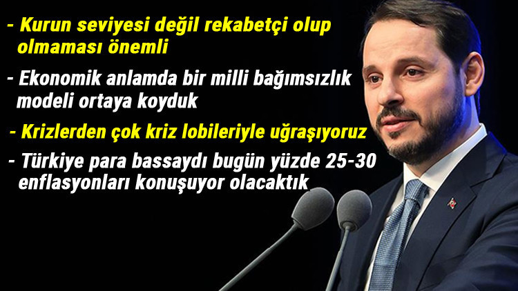 Bakan Albayrak dolar kurundaki hareketliliğe ilişkin olarak "Biz diyoruz ki ihracatçı için benim param cazip olsun. 1 lira 1 dolarcılar vardı. Bu eleştiriyi yapanların bir çoğu bu eleştiriyi yapmayanlar. Bir lira 1 dolar olur mu bunun enflasyon farkı var. Kur 7’lerden 6’lardan 5’lere indi. Tekrar çıktı. Tekrar indi. İner çıkar. Türkiye tüm bu dalgalanmaları düzgün bir şekilde yönetmektedir. Güçlü bir altyapıya sahip." dedi.