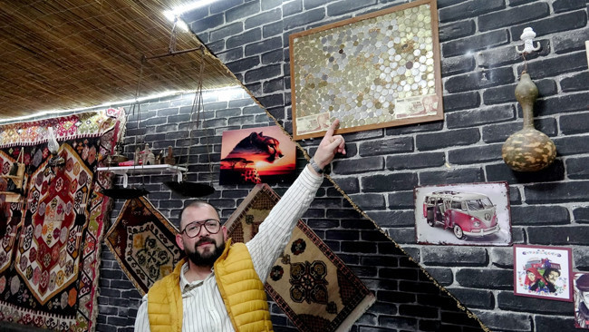 İlçede kıraathane de işleten Ahmet Cihan bu tutkusunu müşterilerinin de görmesini isteyerek 20 yıldır biriktirdiği demir ve kağıt para koleksiyonunu iş yerinde, duvarda sergilemeye başladı.