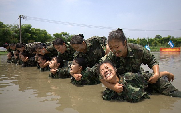 Fotoğraflarda kamuflaj giymiş 20 kadın bazen eğlenerek bazen de acı çekerek eğitimlerine devam ediyor.
