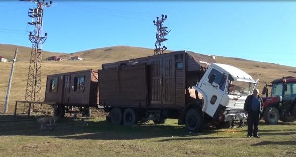 TRABZON'da yaylada ev yapmak isteyen, ancak yapılaşma yasağına takılan Ömer Birinci (55), yıkım endişesi yaşamamak için yaptırdığı 20 metrekarelik ahşap evi kamyon kasasına monte etti. Yıkım olacağı durumlarda kamyon üzerindeki gecekondusuyla yayladan ayrılıp başka yaylalara yönelen Birinci'nin ilginç yöntemi, başrolünü Kemal Sunal'ın oynadığı 'Gülen Adam' filmindeki ev taşıma sahnesini akıllara getirdi.
