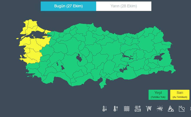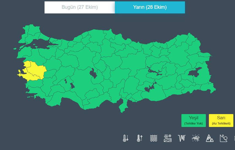 Yarın için de iki il için sarı kodlu alarm verildi. Bu iller ise İzmir ve Manisa oldu.