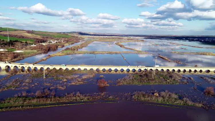 Trakya’da etkili olan sağanak yağışların yanı sıra yüksek kesimlerdeki karların erimesiyle birlikte barajlardaki doluluk oranı arttı, nehirlerin debileri yükseldi. Ergene Nehri’nin debisi de son bir hafta içinde 9 kat artarak, saniyede 179 metreküpe yükseldi. DSİ 11’inci Bölge Müdürlüğü Ergene Nehri için sarı alarm uyarısında bulundu. Ergene Nehri, taşarak çevresindeki tarım alanlarını sular altında bıraktı.