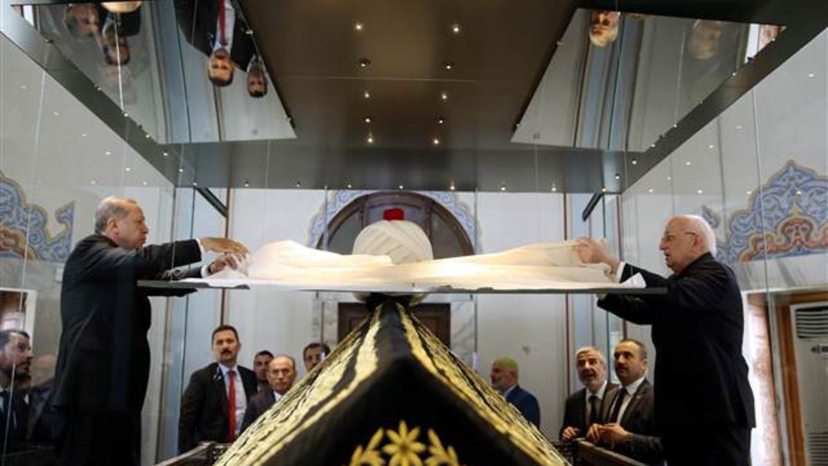 Daha sonra camiden ayrılan Cumhurbaşkanı Erdoğan Yavuz Sultan Selim Türbesini de ziyaret etti. Erdoğan ile TBMM Başkanı İsmail Kahraman, restorasyonu tamamlanan türbede kaftanın üzerindeki örtüyü kaldırdılar.