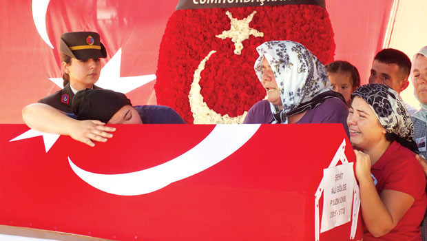 Şanlıurfa Viranşehir’de PKK saldırısında şehit olan Jandarma Uzman Onbaşı Erdi Demirer (26) de dün Ordu Gürgentepe’de toprağa verildi. Şehit eşi Burcu Demirer, 3 aylık oğlunu tabutun üzerine yatırarak, “Vermem seni kimselere” diye ağıt yaktı.
