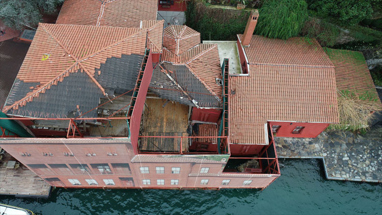 Havadan çekilen görüntülerde yalıdaki hasarın bir kısmının onarıldığı görülüyor. Çalışmaların devam ettiği yalının etrafı ise yalının hasarsız halinin fotoğraflarıyla kapatılmıştı.