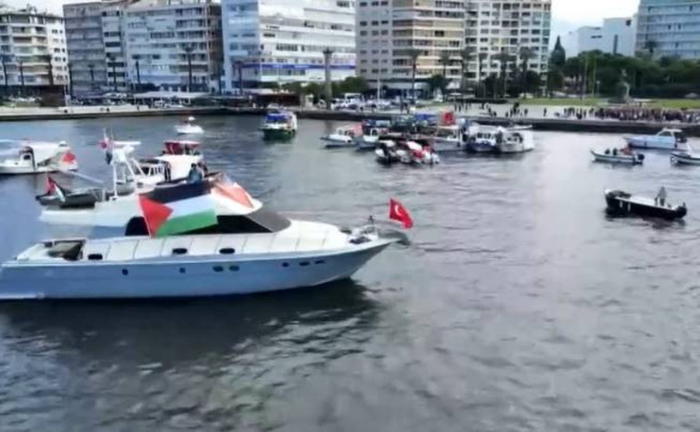 İzmir'de, Türk ve Filistin bayraklarıyla denize açılan tekneler Filistin ile Gazze'ye insani yardım ulaştırmak amacıyla yola çıkan ve İsrail'in saldırısına uğrayan Küresel Sumud Filosu'na destek verdi.
