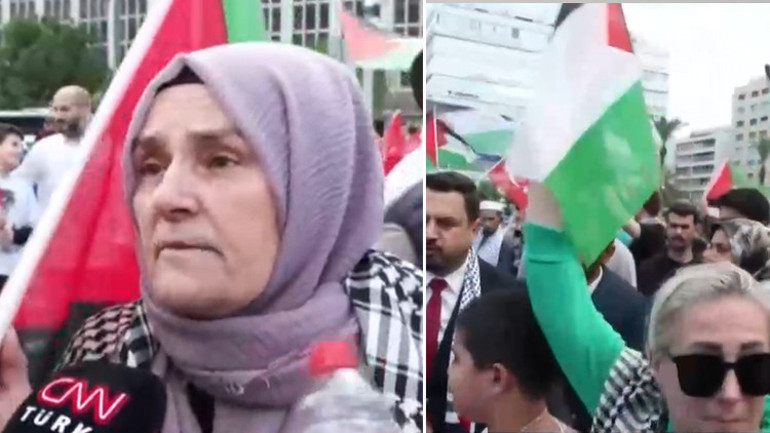 İzmir'de Filistin'e destek yürüyüşünde gösterici bir kadının gözyaşlarını tutamadığı görüldü. Ağlayan kadın kendisine mikrofon uzatan CNN TÜRK Muhabiri Merve Tokaz'a konuşamadı ve 'sadece ağlıyorum' dedi.