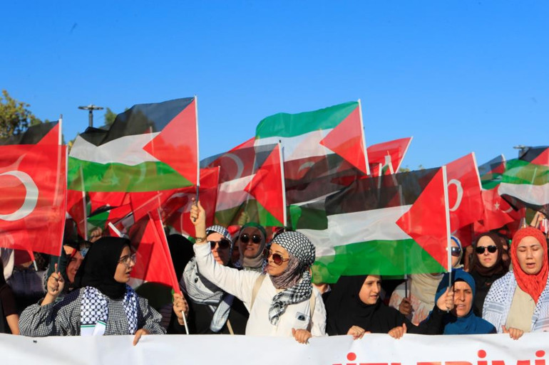 Ankara'da da binlerce vatandaş Filistin'e destek için gösteri düzenliyor. Ellerinde Türk ve Filistin bayraklarıyla gelen çok sayıda vatandaş 'Gazze yalnız değildir' mesajı veriyor.