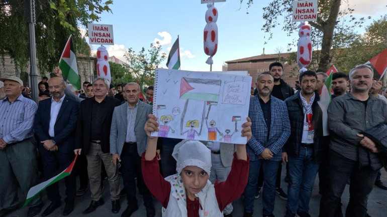 Ankara Filistin Dayanışma Platformuna (ANFİDAP) mensup sivil toplum kuruluşu üyeleri ile yaşlılar, gençler ve çocukların da aralarında olduğu binlerce kişi, Gazze'de yaşanan soykırıma dikkati çekmek ve İsrail'e tepkilerini yükseltmek için Melike Hatun Camisi önünde toplandı.