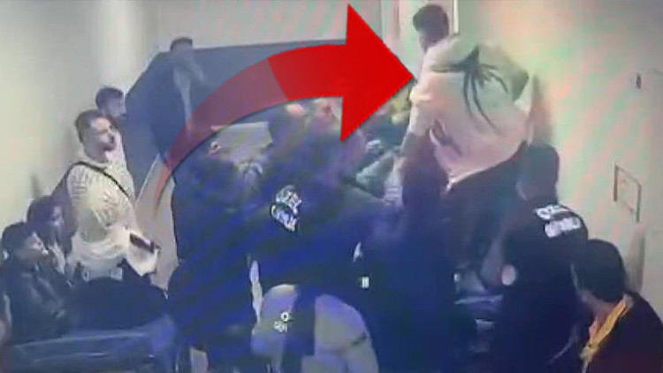 Görüntülerde, hastane koridorunda tartışma sırasında sedye üzerine çıkan kişinin doktora saldırdığı görülüyor.