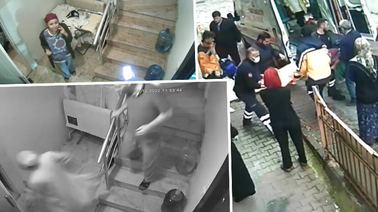 Olayın ardından kadının oğlu ve gelininin yaşadığı dehşet anları ise güvenlik kameralarına saniye saniye yansıdı. Görüntülerde, kadının sert bir şekilde yere düştüğü sesi duyuluyor. Ardından kadının oğlu ve gelini bağırıyor. Gelinin “anne” diye feryat ederek panikle merdivenlerden aşağıya iniyor. Oğlu ise zemin katın kapısına açarak kadının düştüğü yere giriyor.