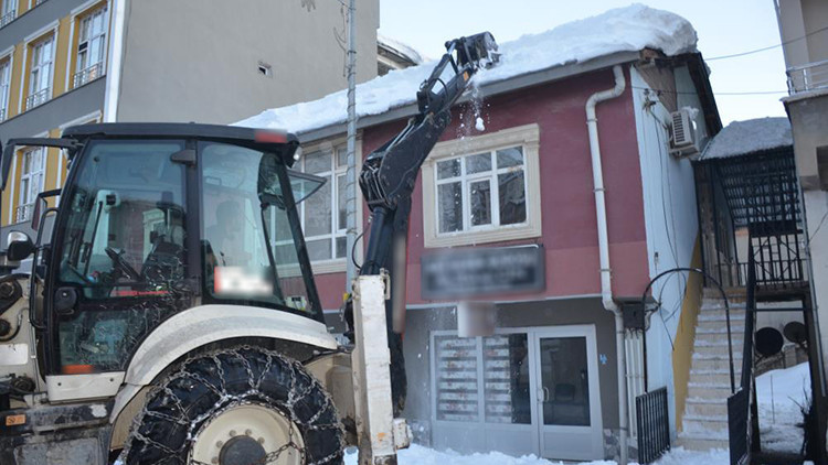 Şırnak’ın Beytüşşebap ilçesinde etkili olan kar yağışı sonrası çatılarda biriken kar buz tutunca vatandaşlar temizlemekte güçlük çekti. İlçe merkez çarşısında yolda biriken karı temizleyen kepçe operatörü, vatandaşlar çatılara çıkmasın diye metrelerce yükseklikteki buz kütlelerini kepçenin kovasıyla kırıp temizlemeye çalıştı.