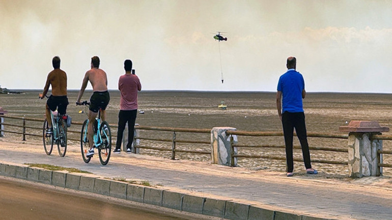 Diğer yandan yangına müdahale eden söndürme helikopterleri, yakın noktadaki denizden su alarak alevlere döktü. Bu sırada sahilde bulunan tatilciler, yangın söndürme helikopterlerini izledi.