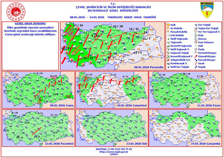 Meteoroloji Genel Müdürlüğü tarafından yapılan tahminlere göre: Ülkemiz genelinin parçalı ve çok bulutlu, Marmara, Ege, Akdeniz, İç Anadolu, Karadeniz, Doğu Anadolu ile Gaziantep, Kilis, Adıyaman ve Diyarbakır çevrelerinin yağışlı geçeceği tahmin ediliyor. Hava sıcaklıklarının 10 derece birden düşmesi ile yeni bir soğuk hava dalgasının etkisi altına girilecek. Bugün itibariyle başlayan soğuk havanın etkisinin önümüzdeki haftaya kadar devam etmesi bekleniyor.