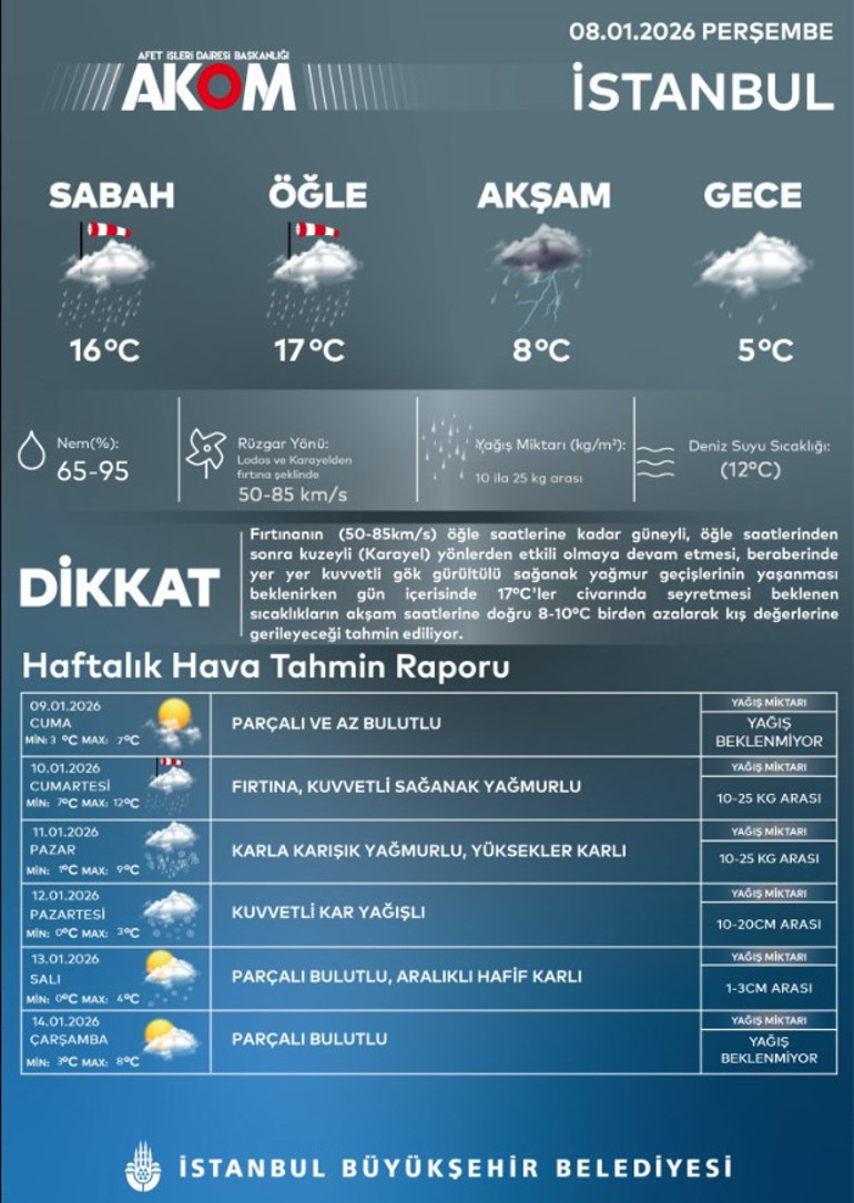 İstanbul Büyükşehir Belediyesi Afet Koordinasyon Merkezi (AKOM) İstanbul için kuvvetli kar uyarısında bulundu. Uyarıda kent genelinde Pazar günü karla karışık yağmurun etkili olacağı belirtilirken, Pazartesi günü ise kuvvetli kar yağışı beklendiğine yer verildi.