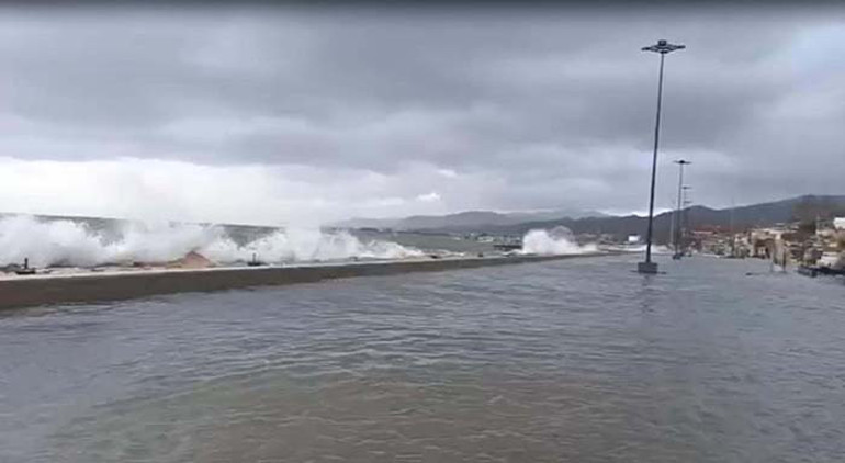 Balıkesir'in Edremit ilçesinde saatteki hızı yer yer 60 kilometreyi aşan lodos nedeniyle denizde dalga boyu 2 metreyi aştı. Taşan deniz suyu ile kaldırımla birleşti.