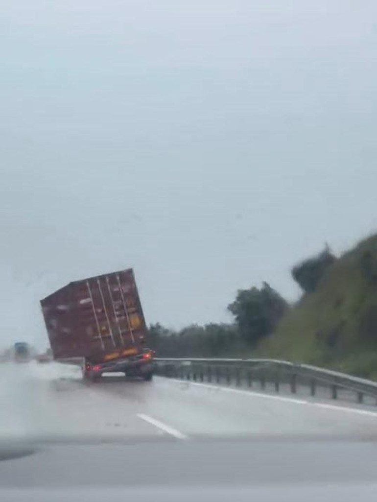 Konteyner yüklü bir TIR’ın dorsesindeki konteyner de rüzgarın etkisiyle kaydı. O anlar cep telefonu kamerasıyla kaydedildi.
