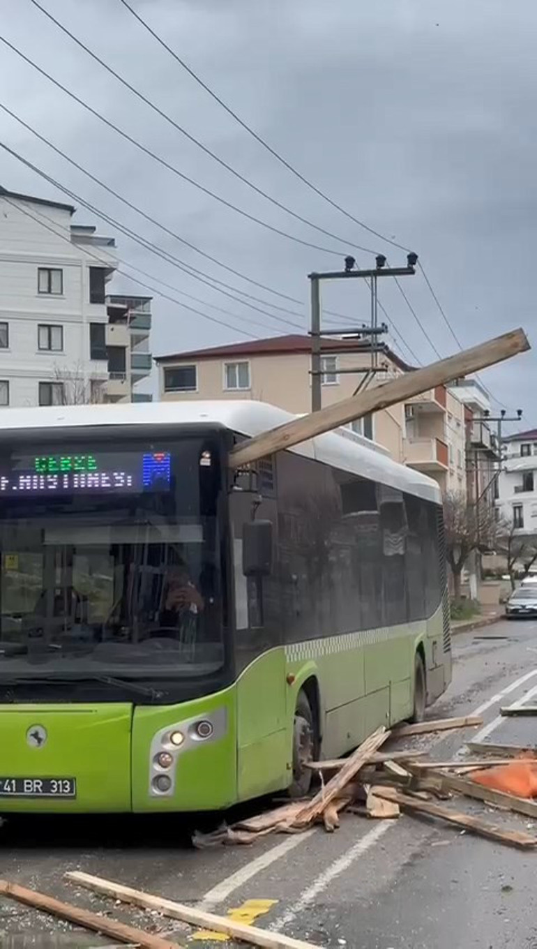 Kocaeli’de etkili olan kuvvetli rüzgar, kentin batı yakasında da etkisini artırdı. Darıca ilçesi Fevzi Çakmak Mahallesi Dr. Zeki Acar Caddesi’ndeki bir binanın çatısından kopan tahta parçası, yoldan geçen 41 BR 313 plakalı Kocaeli Büyükşehir Belediyesi’ne ait halk otobüsüne saplandı.