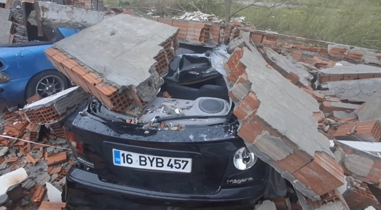 Bursa’da saatteki hızı 105,5 kilometreye ulaşan fırtına hayatı olumsuz etkiledi. Bir evin bahçe duvarının yıkılmasıyla 10 araç hasar görürken, fırtınanın verdiği hasar gündüz görüntülendi.