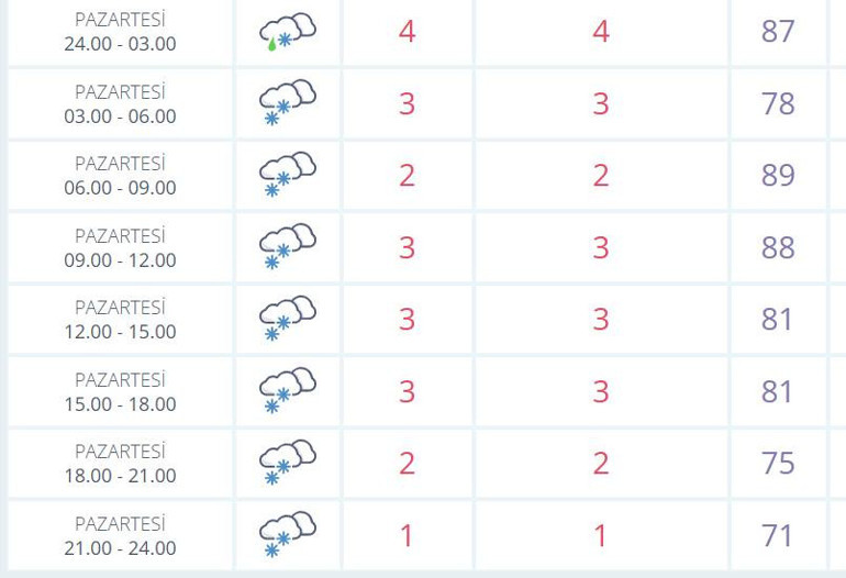 Açıklamada, rüzgarın kuzeyli yönlerden fırtına (50-70 km/saat) şeklinde esmesi beklendiğinden çatı uçması, ağaç devrilmesi ve baca gazı zehirlenmesi risklerine karşı tedbirli olunması gerektiğine dikkati çekilen açıklamada, kentte 12 Ocak Pazartesi aralıklı kar yağışlı (2/3°C), 13 Ocak Salı parçalı ve çok bulutlu (-1/5°C), 14 Ocak Çarşamba aralıklı yağmurlu (4/9°C), 15 Ocak Perşembe parçalı bulutlu (7/11°C) havanın beklendiği bildirildi.