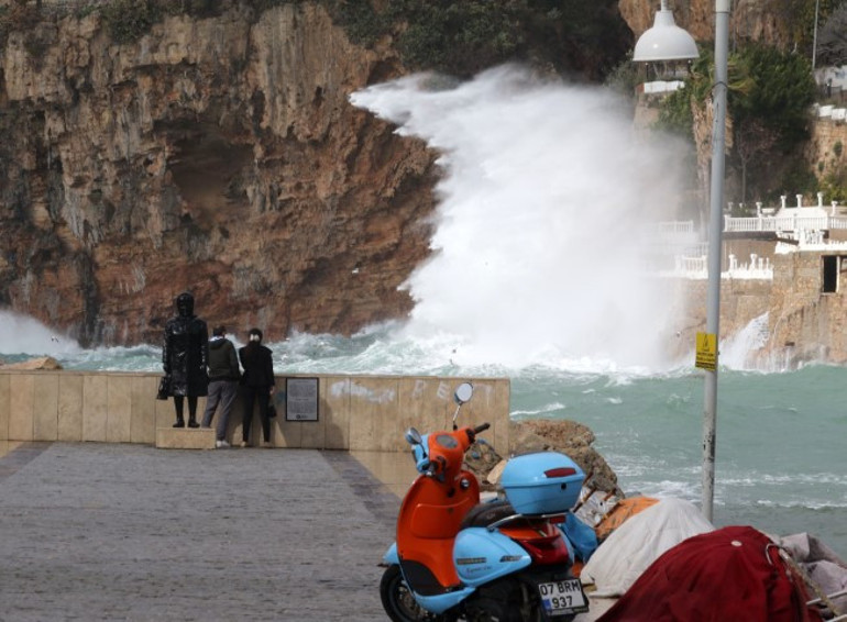 Antalya'da kuvvetli rüzgar, özellikle denizde etkisini artırdı. Sahil kesimlerinde dev dalgalar 25 metrelik falezleri dövdü. Yat Limanı'ndaki teknelerini güvene almak isteyen tekne sahiplerinin, dev dalgalara karşı önlem aldığı görüldü.