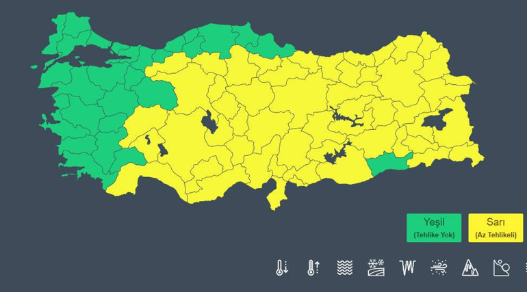 Meteoroloji Genel Müdürlüğü'nün güncel hava durumu tahmin raporuna göre 53 il için sarı kodlu alarm verildi. Bu iller sırasıyla şunlar oldu: