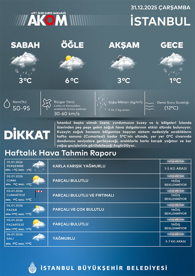 İstanbul Büyükşehir Belediyesi (İBB) Afet Koordinasyon Merkezi (AKOM), kentte yılbaşında karla karışık yağmur ve don riskine karşı uyarıda bulundu.
