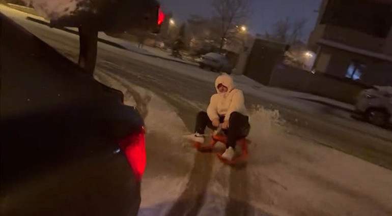 Diğer yandan İnegöl ilçesinde dün akşam saatlerinde kar yağışının ardından bir vatandaş, kızağını otomobilinin arkasına halatla bağladı. Beyaza bürünen asfalt üzerinde kayarak ilerleyen vatandaş, kar yağışının keyfini çıkardı.