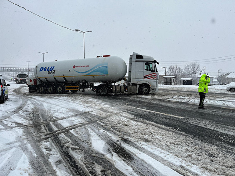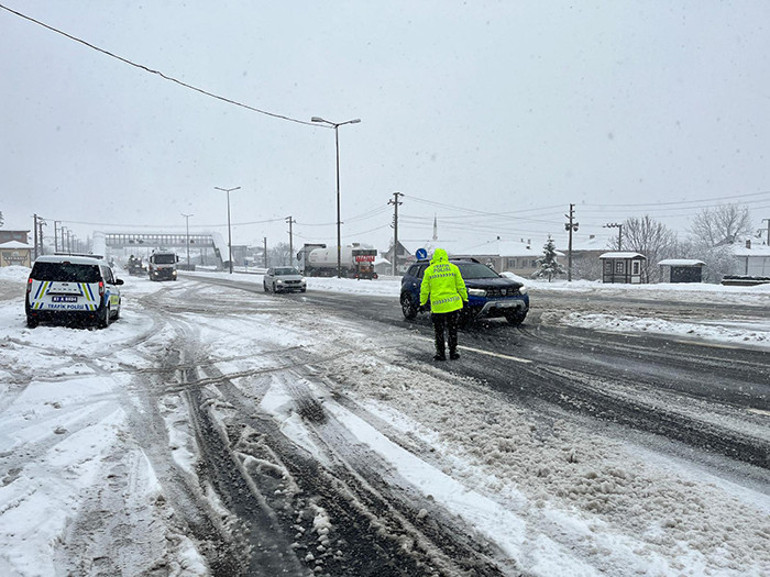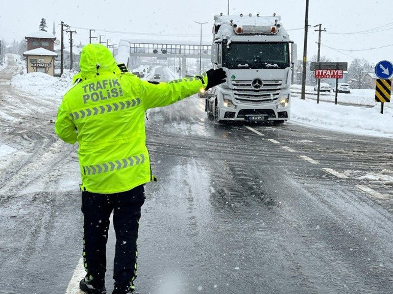 Yoğun kar yağışı nedeniyle ağır tonajlı araçların sürücüleri, buradaki kavşaktan geri döndürülüyor.