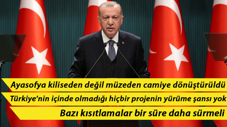 Son günlerdeki önemli bir gelişmenin de Ayasofya'nın statüsü konusunda yaşadığına işaret eden Erdoğan, "Ayasofya'nın müzeden camiye döndürülerek vakfiyesindeki amaca uygun şekilde hizmet vermeye başlayacak olması hepimizi şüphesiz ki sevindirmiştir. Burada bir kez daha Ayasofya'nın kiliseden değil müzeden camiye dönüştürüldüğünün altını çizmek istiyorum." ifadesini kullandı.