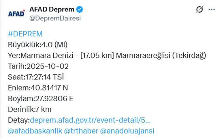 Afet ve Acil Durum Yönetimi Başkanlığı’nın merkez üssünü Marmara Denizi’nde Tekirdağ’ın Marmaraereğli ilçesinin 18,24 kilometre açığı olarak saptadığı deprem, saat 14.55’te oldu. Yerin 6,71 kilometre derinliğinde meydana gelen deprem, Tekirdağ’ın yanı sıra başta İstanbul olmak üzere çevre illerden de hissedildi. Kısa süreli paniğe neden olan depreme ev ve iş yerlerinde yakalanan vatandaşlar, dışarı çıktı.