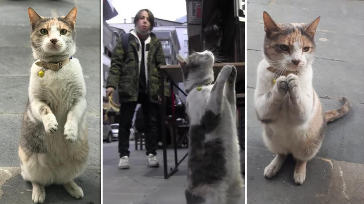 Arka ayaklarının üzerine kalkarak ön patilerini birleştiren kedi, yaptığı hareketle restorandan yiyeceğini alıyor. Yemeğini yedikten sonra tekrar cadde üzerinde dolaşan kedi acıktığı zaman yeniden restorana giderek aynı hareketi yapıyor.